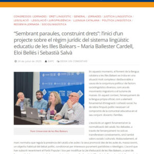 - Cardell et al. (2025)Ballester, M., Bellés, E., i Salvà, S. (2025). “Sembrant paraules, construint drets”: l’inici d’un projecte sobre el règim jurídic del sistema lingüístic educatiu de les Illes Balears. Blog de Llengua i Dret https://eapc-rld.blog.gencat.cat/2025/07/24/sembrant-paraules-construint-drets-linici-dun-projecte-sobre-el-regim-juridic-del-sistema-linguistic-educatiu-de-les-illes-balears-maria-ballester-cardell-eloi/