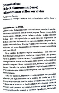 - Bellés (2025) – onomàsticaBellés, E. (2025). Onomàstica: el dret d’anomenar(-nos) i d’anomenar el lloc on vivim. Dins: V. Tasa Fuster (Coord.), El dret a la llengua. Per una nova Declaració Universal de Drets Lingüístics amb perspectiva de futur. Saldonar.