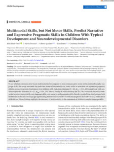 - Florit-Pons et al. (2025)Florit-Pons, J., Pronina, M., Igualada, A., Prieto, P., i Norbury, C. (2025). Multimodal Skills, but Not Motor Skills, Predict Narrative and Expressive Pragmatic Skills in Children With Typical Development and Neurodevelopmental Disorders. Child Dev, 96, 1807-1824. https://doi.org/10.1111/cdev.70015