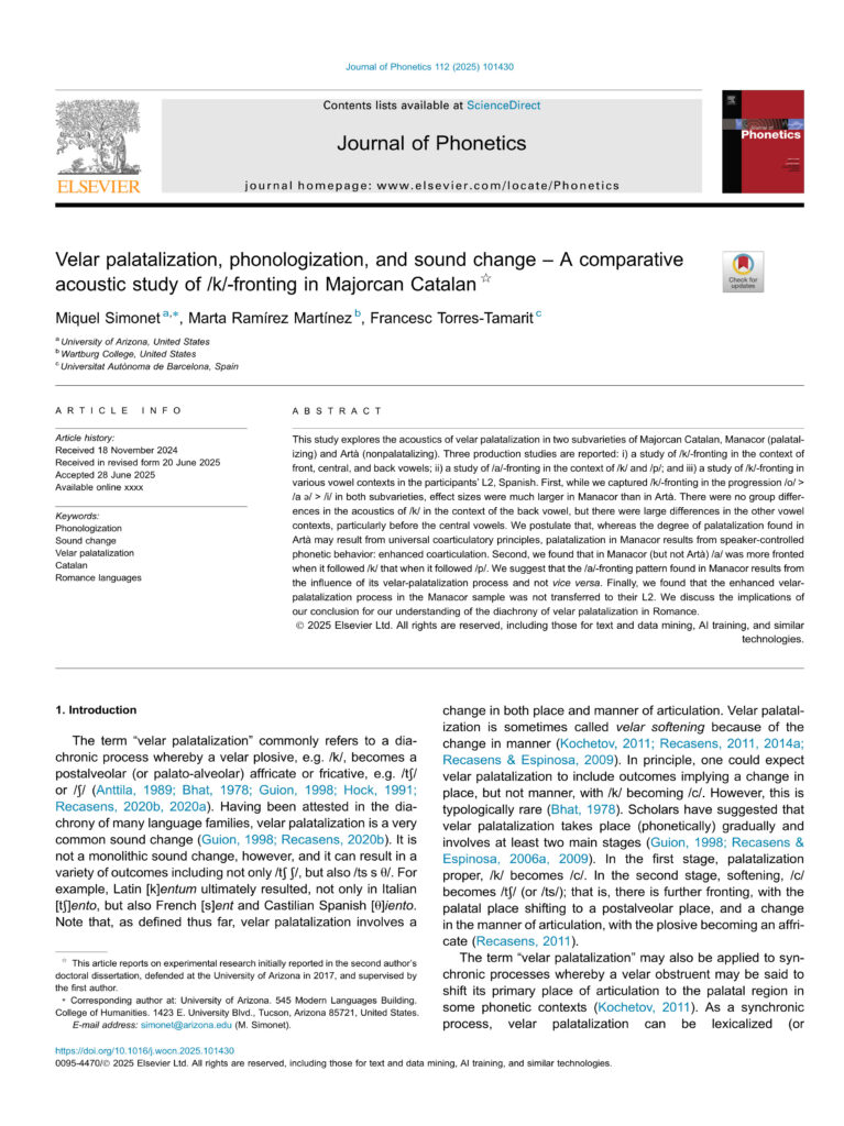 Simonet, M., Ramírez Martínez, M., i Torres-Tamarit, F. (2025). Velar palatalization, phonologization, and sound change: A comparative acoustic study of /k/-fronting in Majorcan Catalan. Journal of Phonetics, 112, 101312. https://doi.org/10.1016/j.wocn.2025.101312