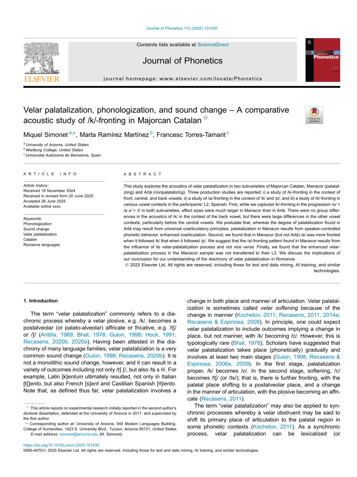 Simonet, M., Ramírez Martínez, M., i Torres-Tamarit, F. (2025). Velar palatalization, phonologization, and sound change: A comparative acoustic study of /k/-fronting in Majorcan Catalan. Journal of Phonetics, 112, 101312. https://doi.org/10.1016/j.wocn.2025.101312