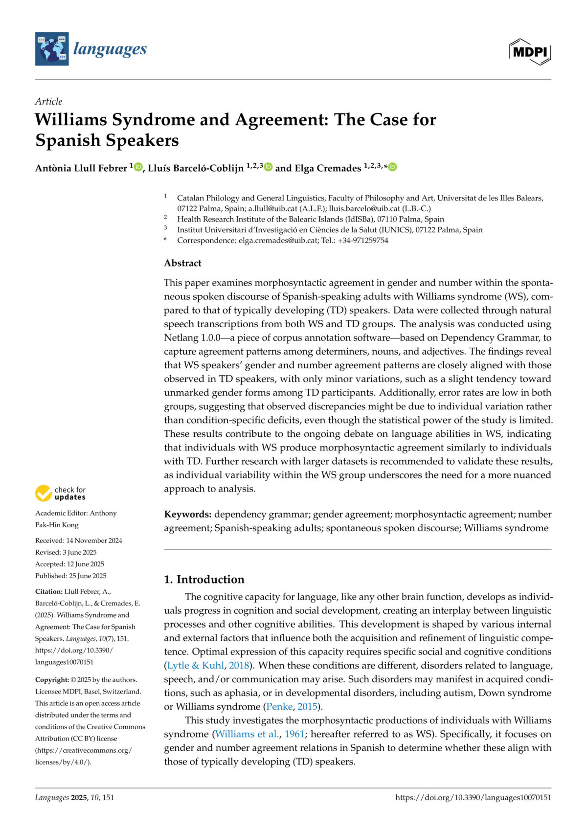 Llull Febrer, A., Barceló-Coblijn, L., i Cremades, E. (2025). Williams Syndrome and Agreement: The Case for Spanish Speakers. Languages, 10(7), 151. https://doi.org/10.3390/languages10070151