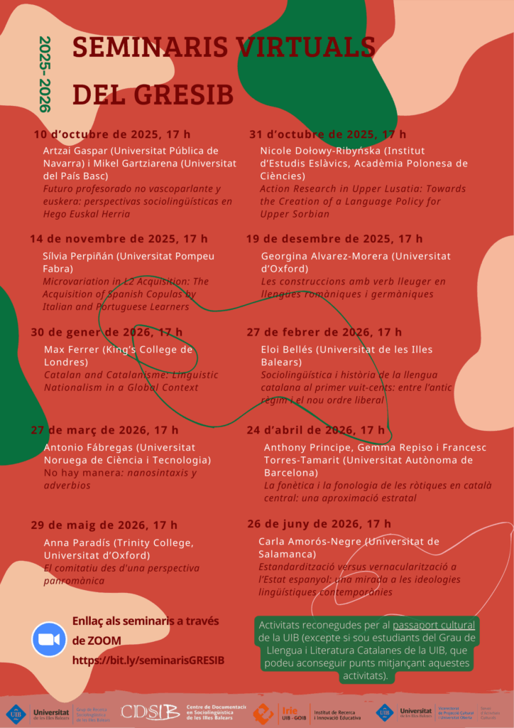 Des del curs acadèmic 2020-21, el GRESIB organitza un cicle de seminaris que tracten temàtiques diverses relacionades amb la sociolingüística i disciplines relacionades. Les sessions tenen una periodicitat mensual i es realitzen en línia a través d’aquest enllaç. Per assistir a les sessions, no cal inscripció prèvia. A més, els Seminaris virtuals del GRESIB són una activitat reconeguda per al passaport cultural de la UIB.