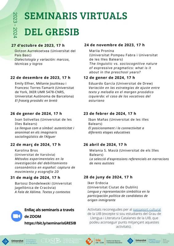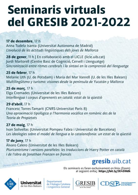 Des del curs acadèmic 2020-21, el GRESIB organitza un cicle de seminaris que tracten temàtiques diverses relacionades amb la sociolingüística i disciplines relacionades. Les sessions tenen una periodicitat mensual i es realitzen en línia a través d’aquest enllaç. Per assistir a les sessions, no cal inscripció prèvia. A més, els Seminaris virtuals del GRESIB són una activitat reconeguda per al passaport cultural de la UIB.